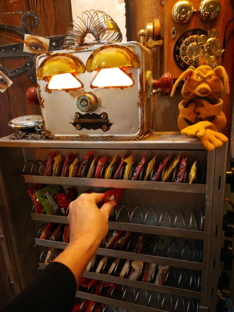 *metal vending machine, metal lunch box, various metal and wood pieces of junk to create arms, face, ears, knobs etc…; tin snips, hot glue gun, drill bits, metal screws, night light kit,