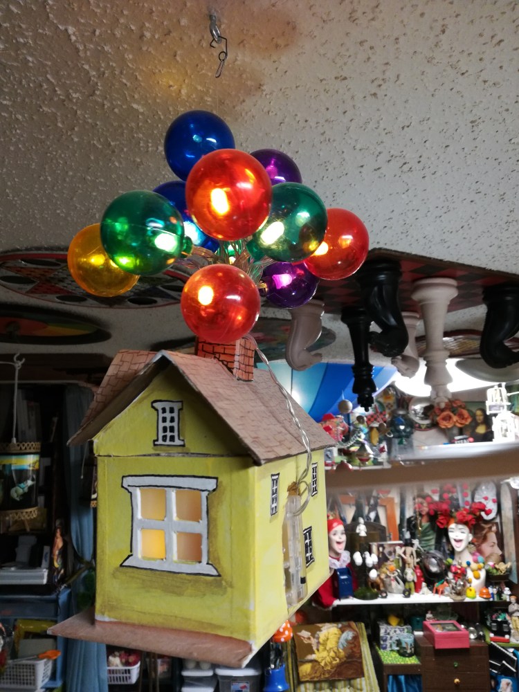 This little “Up” house would make a great colorful addition to a child or baby’s room and it is very easy to make. You could upgrade this simple design by using an electric set of lights which removes the need to worry about turning the switch on and off or batteries. If needed, an extension cord could be used to hang the lamp similar to a swag lamp.