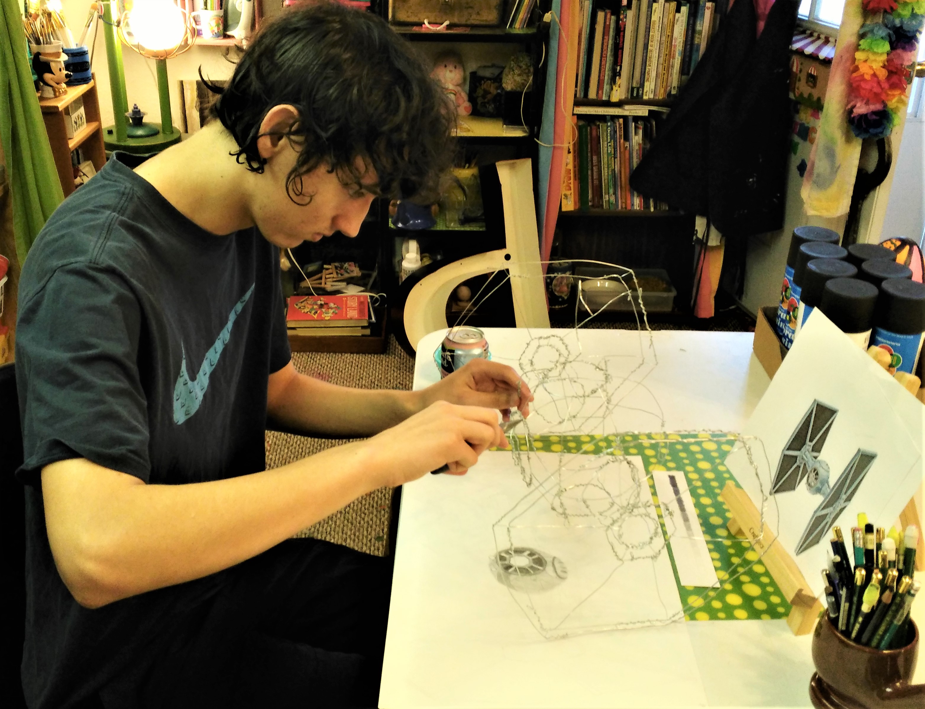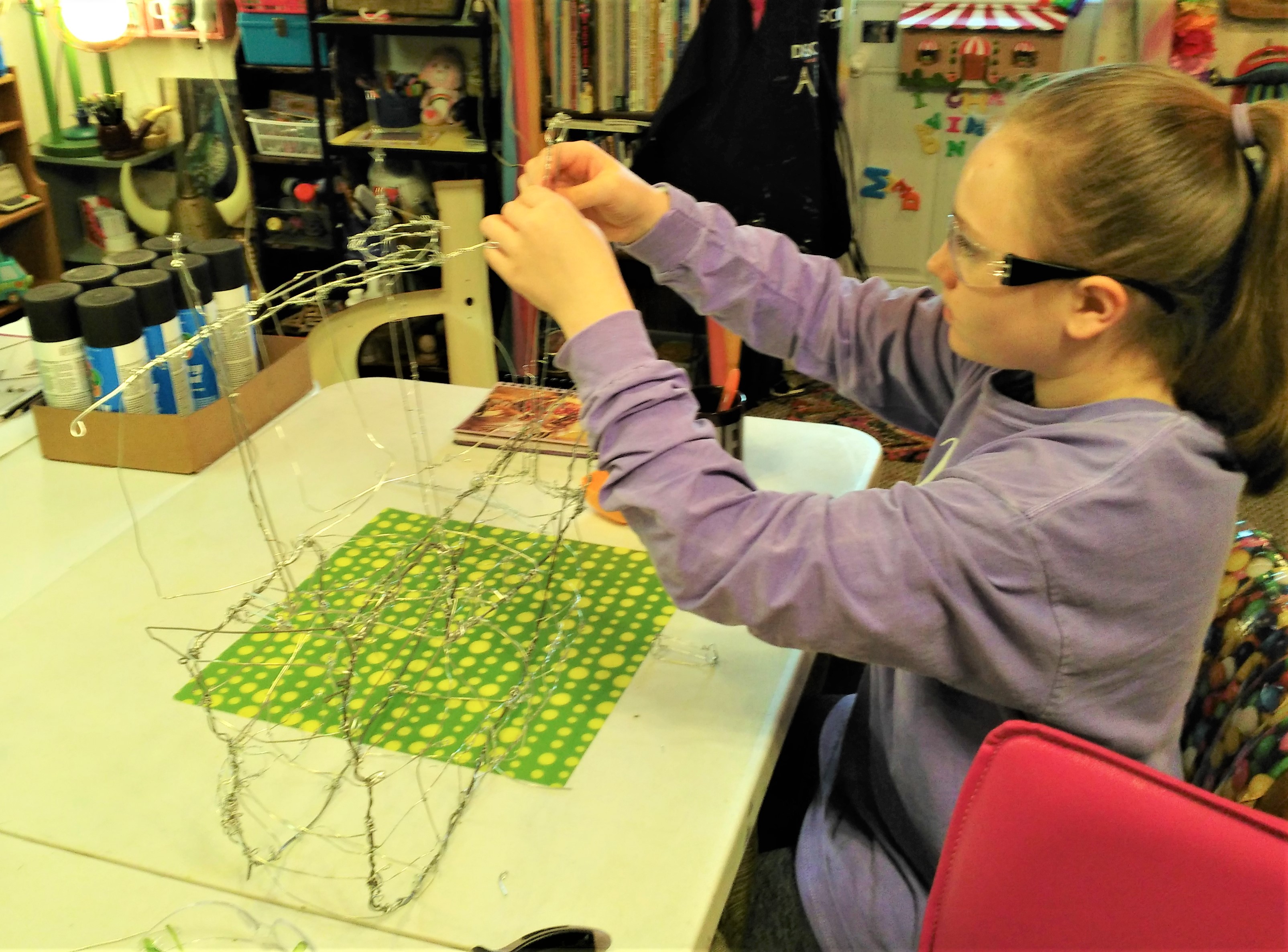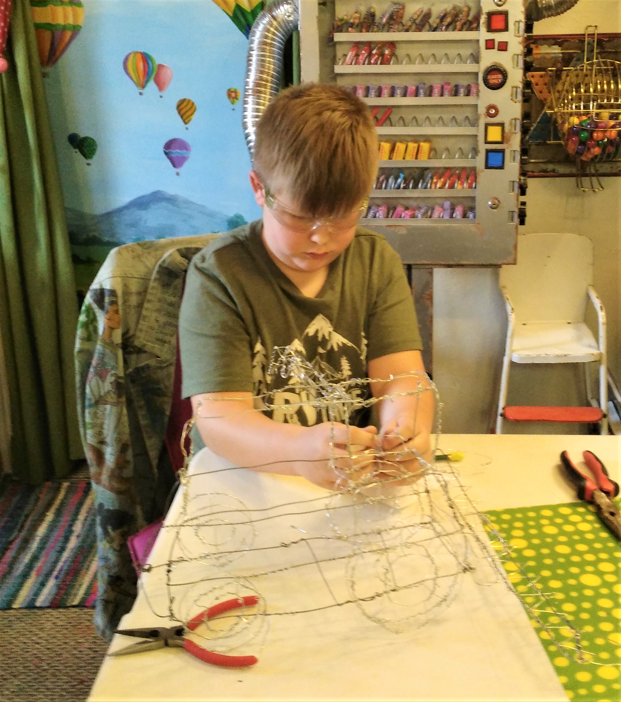 A 3-D project to get the kids thinking about how a 2-D line drawing becomes a 3-D line drawing. They chose a vehicle of some sort (boat, vehicle, trucks, cars, etc) and drew them with the line of the wire.