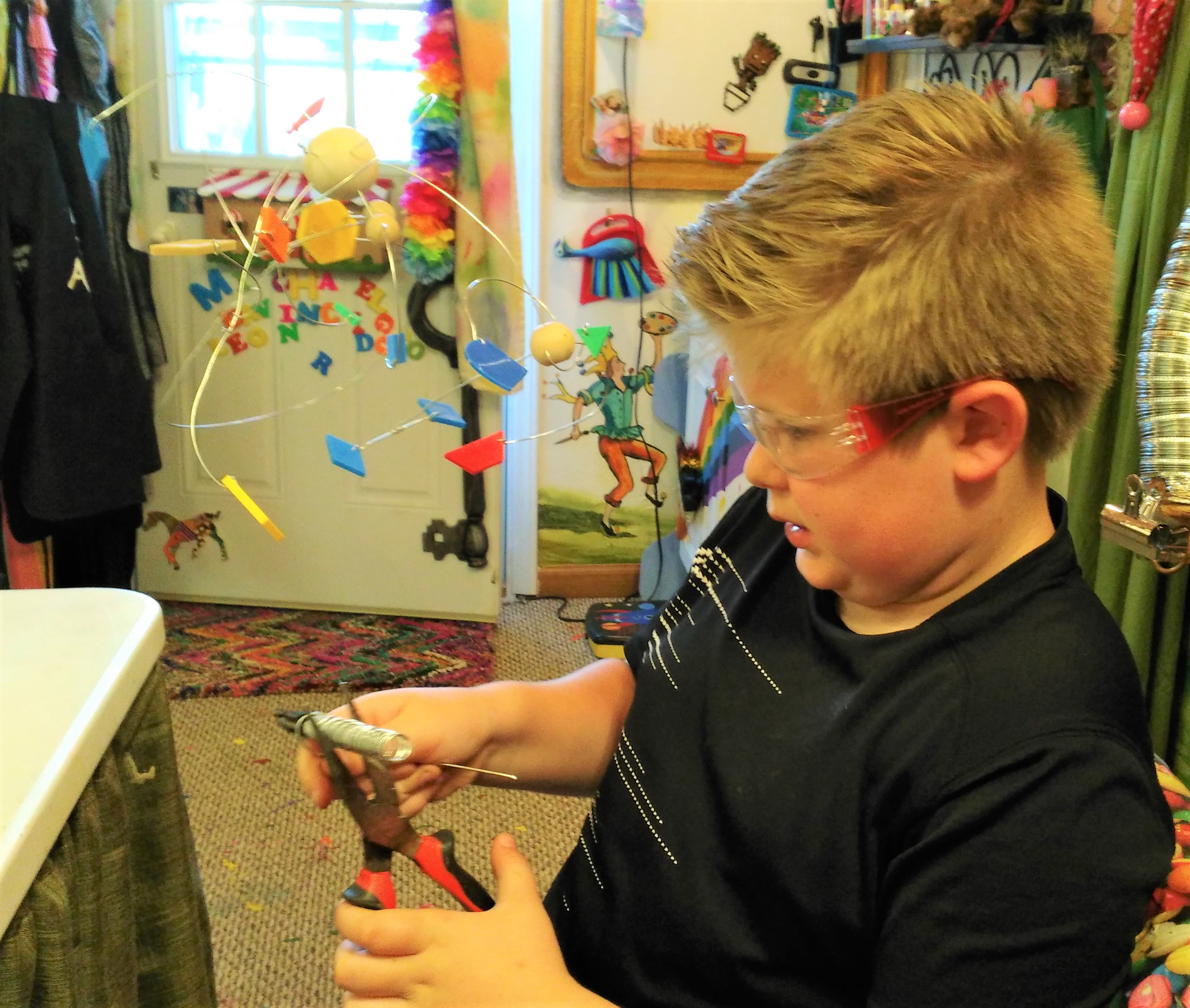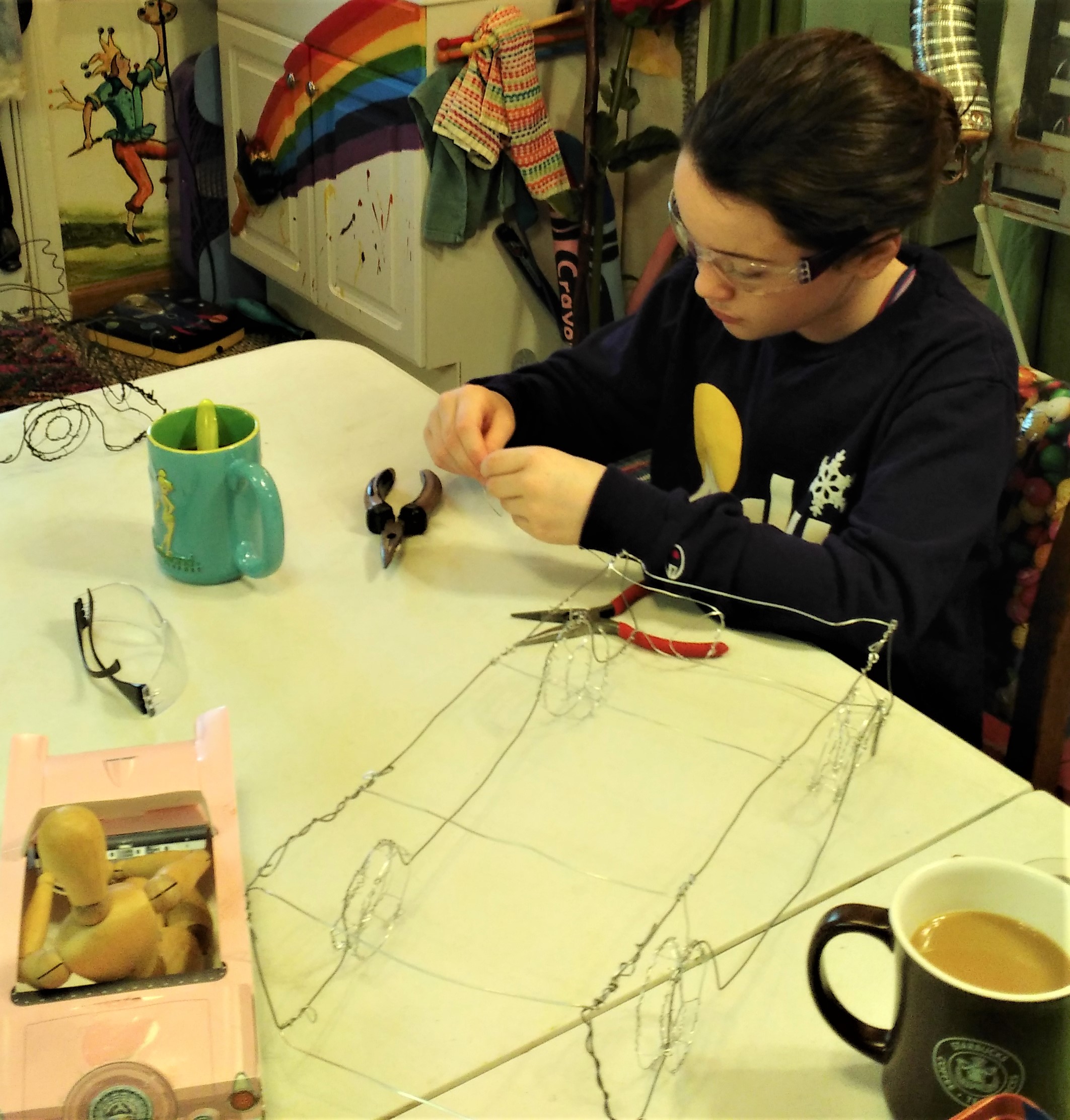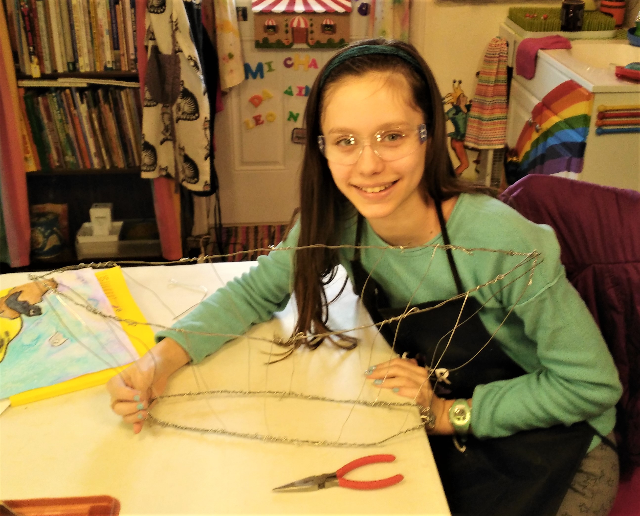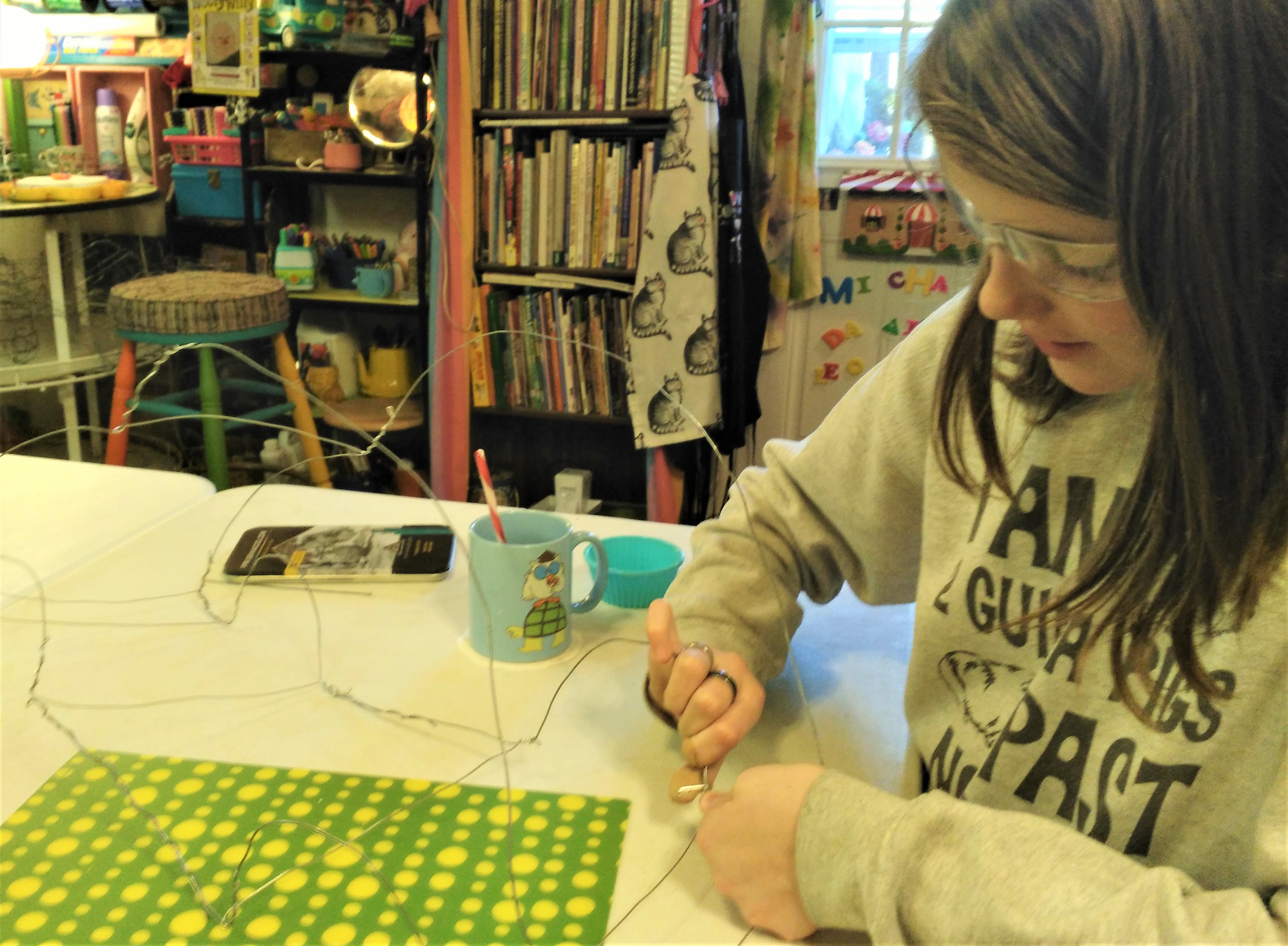 A 3-D project to get the kids thinking about how a 2-D line drawing becomes a 3-D line drawing. They chose a vehicle of some sort (boat, vehicle, trucks, cars, etc) and drew them with the line of the wire.